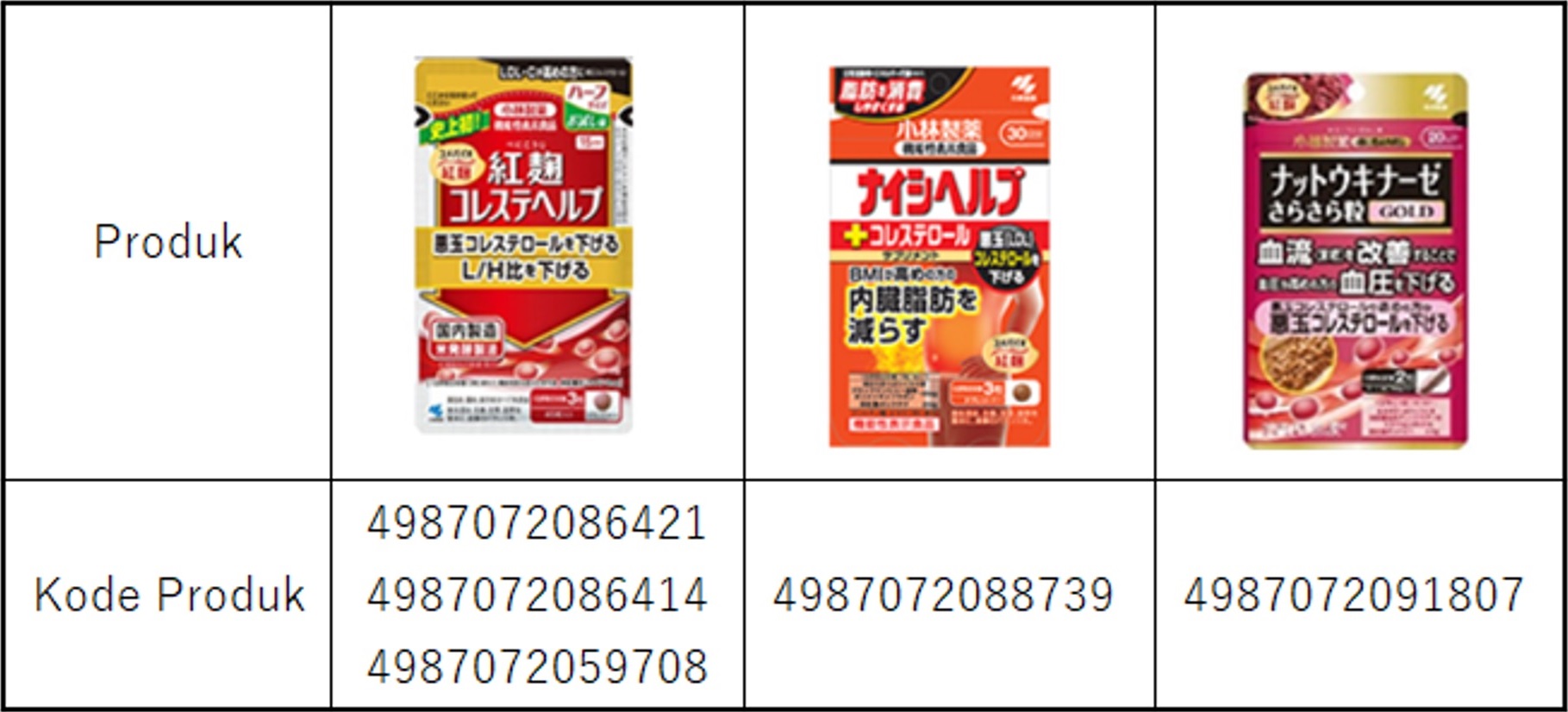 Saat ini, kami belum dapat mengidentifikasi bahan pastinya dan juga belum dapat mengidentifikasi dengan jelas hubungan sebab akibat antara produk ini dan masalah ginjal. Namun, sebagai tindakan pencegahan untuk mencegah penyebaran bahaya kesehatan kepada pelanggan kami, kami memutuskan untuk secara sukarela menarik kembali produk terkait “Beni-koji” yang tercantum di bawah ini sebagai Produk Subjek. Meskipun PT. Kobayashi Pharmaceutical Indonesia tidak menjual produknya di Indonesia, pelanggan yang telah membeli produk di Jepang, dll dapat menghubungi PT. Kobayashi Pharmaceutical Indonesia untuk meminta pengambilan.